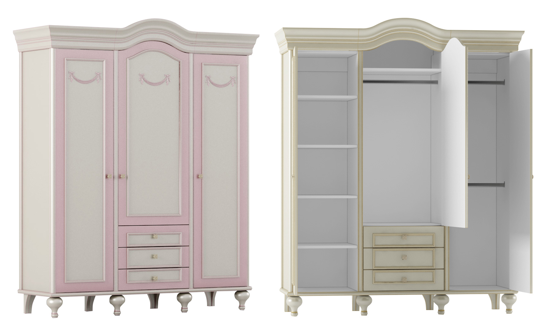 код 89973Шкаф в три двери. Вешалка для одежды, три выдвижных ящика. Шесть уровней полок.