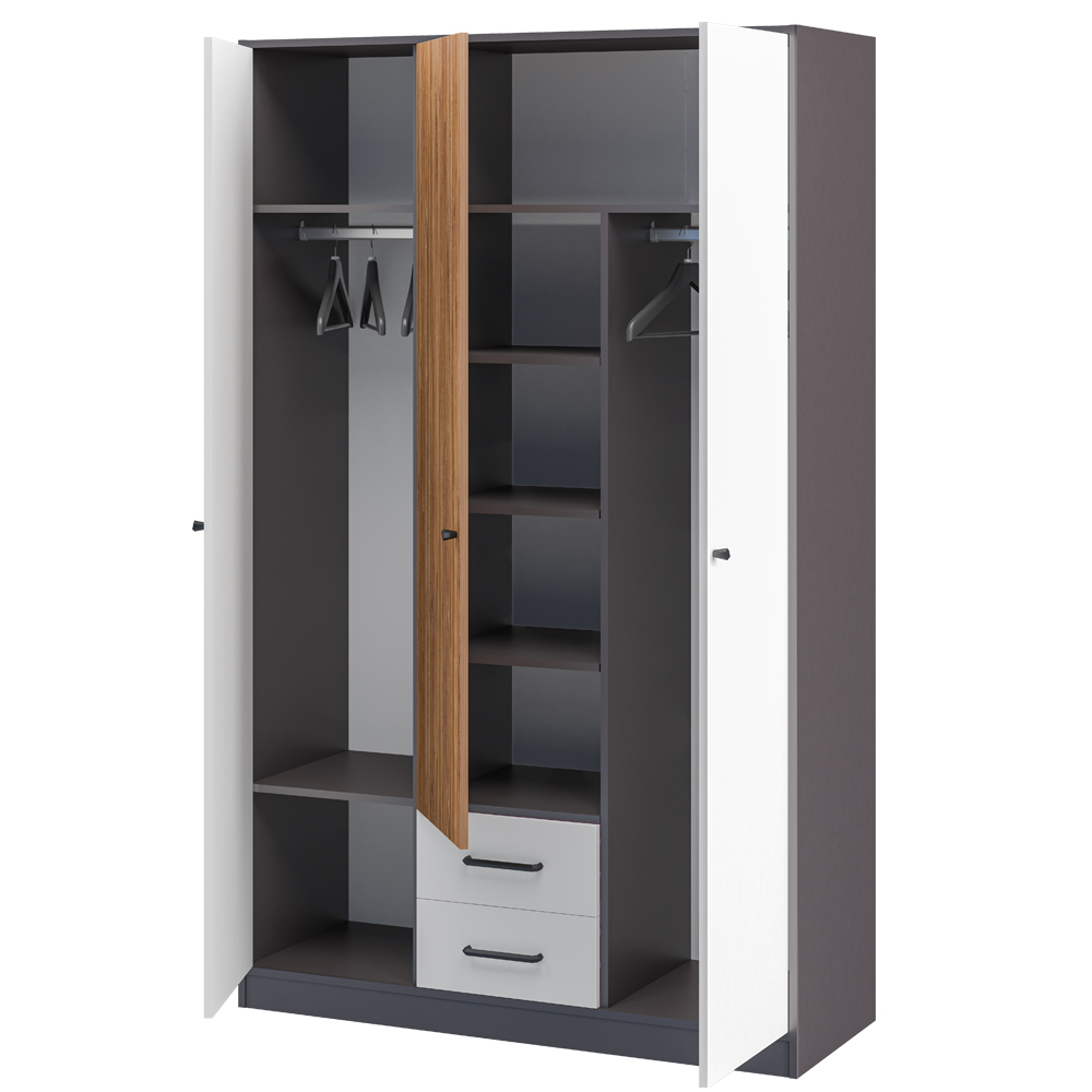 Шкаф оснащен полками, отсеком со штангой для плечиков и выдвижными ящиками.