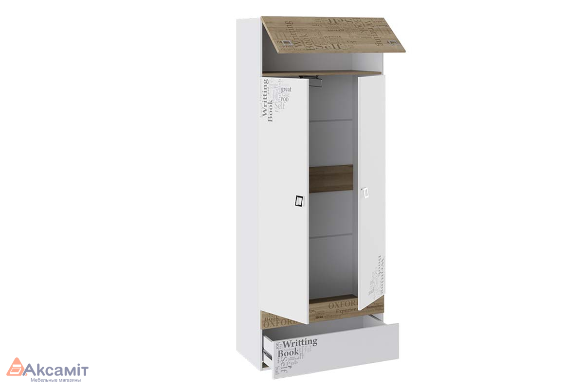Шкаф оснащен полками, отсеком со штангой для плечиков и выдвижными ящиками.