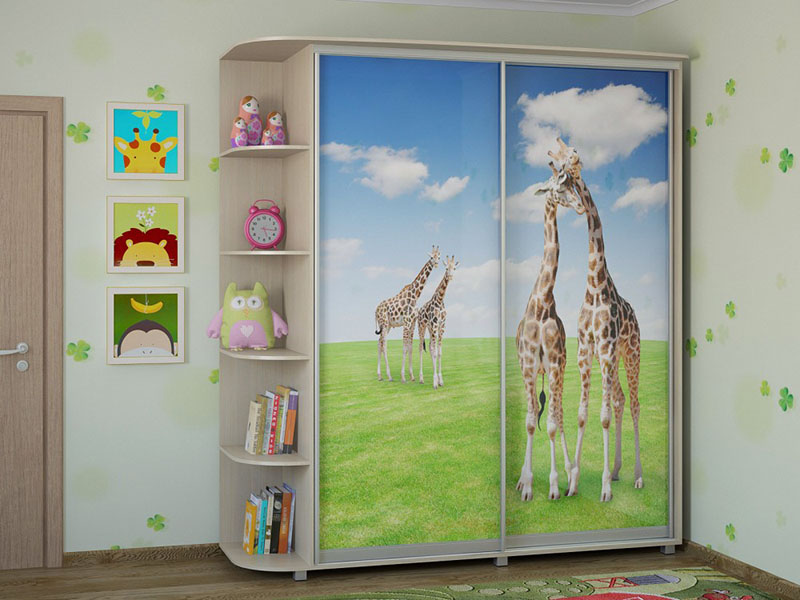 Шкаф-купе является наилучшим выбором для детской, так как выполнен из экологически чистых и качественных материалов. Две створки с угловой секцией на пять радиусных полок прекрасно подойдут для размещения книжек и любимых игрушек. Корпус под светлый орех, профиль цвета металлик, на фасаде фотопринт с изображением лужайки с жирафами.
