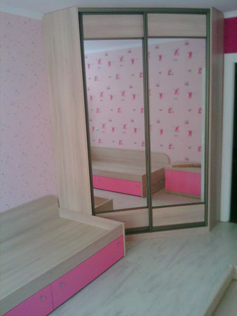 Достаточно простая и функциональная модель углового шкафа-купе прекрасно впишется в небольшую комнату в современном стиле. Материалом для изготовления конструкции шкафа является высококачественное и экологически чистое дерево, за счет которого будет создана приятная и благотворная атмосфера, а изделие можно использовать в детских комнатах и спальнях.