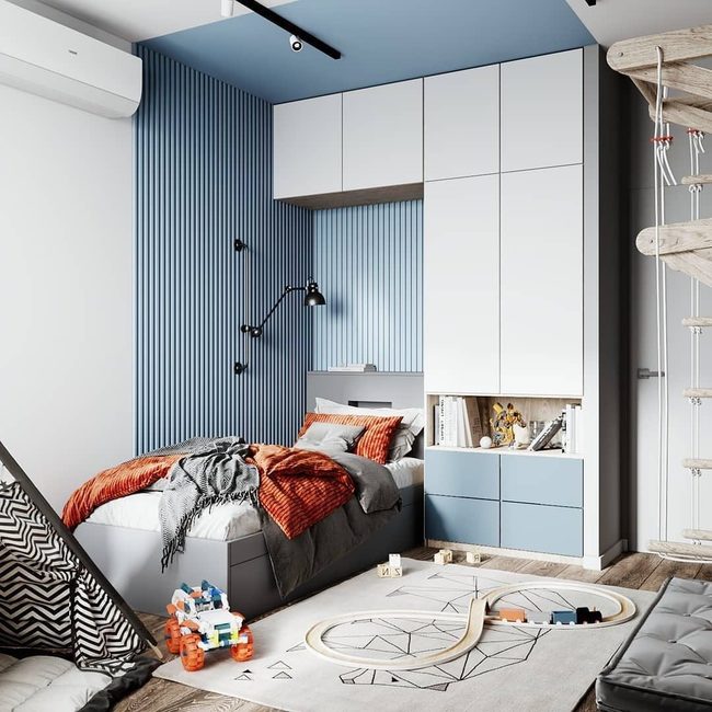Цвет: белый, синий. Фасады без ручек. Выдвижные ящики.