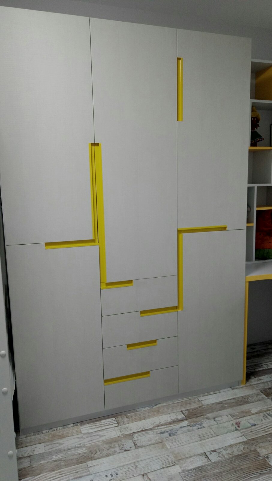 Оригинальный дизайн. Яркие врезные ручки.