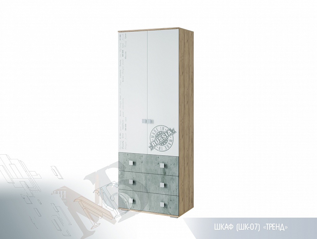 Шкаф оснащен полками, отсеком со штангой для плечиков и выдвижными ящиками.