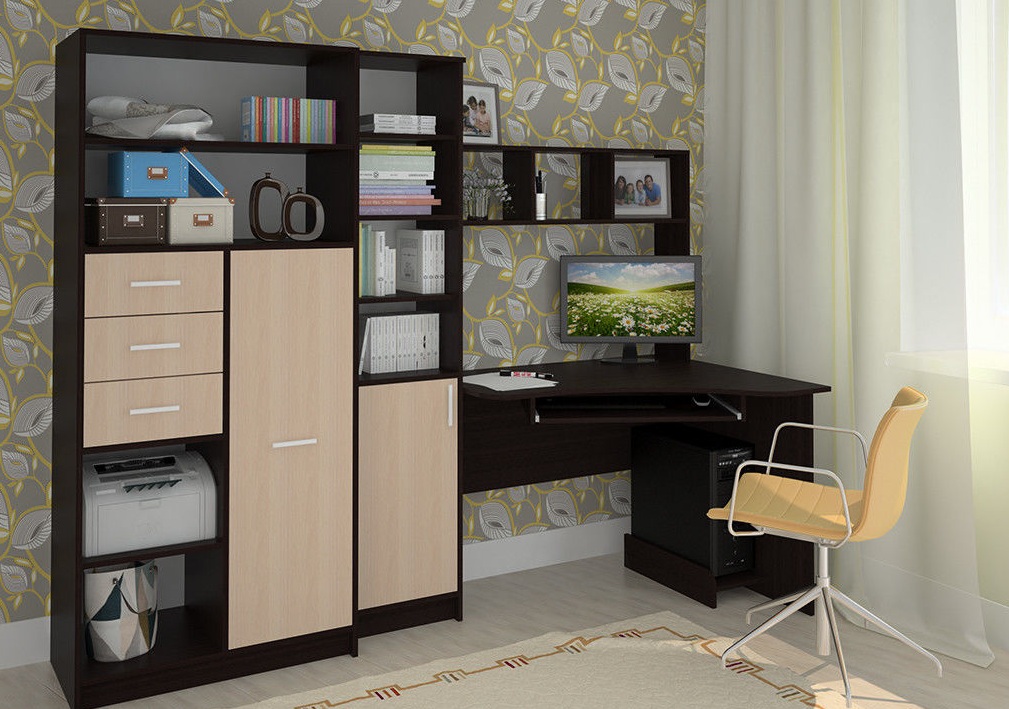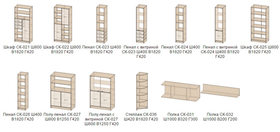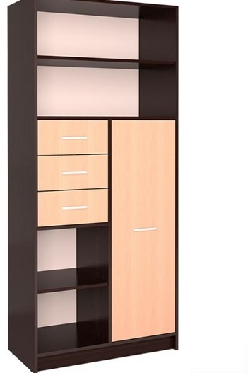 Состоит из 3-секций: штанги для одежды; полки открытые/закрытые, выдвижные ящики; закрытые полки