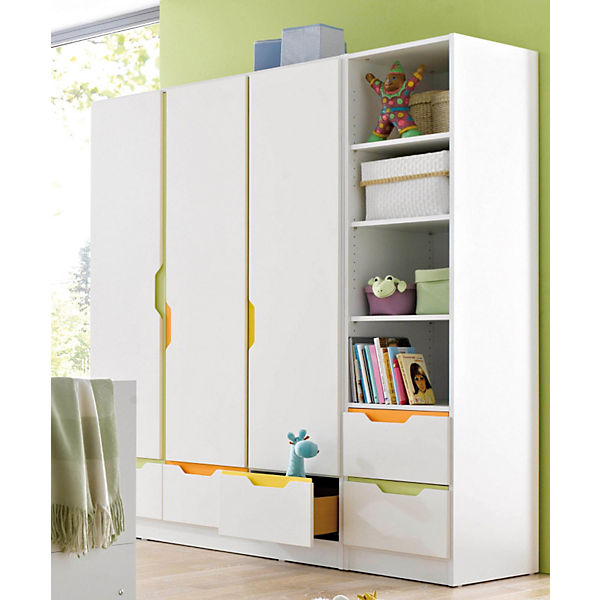 Функциональный и вместительный шкаф в детскую комнату. Открытые полки, ящики для игрушек.