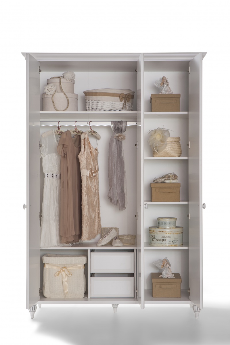 Состоит из 3-секций: штанги для одежды; полки открытые/закрытые, выдвижные ящики; закрытые полки