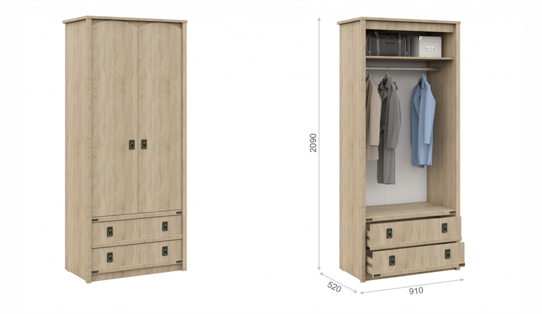 Шкаф оснащен полками, отсеком со штангой для плечиков и выдвижными ящиками.