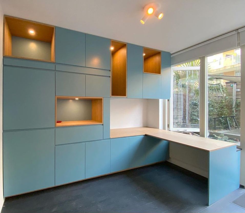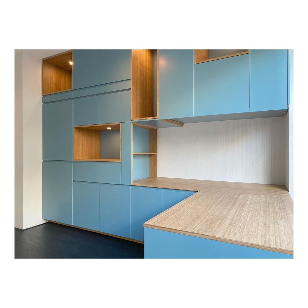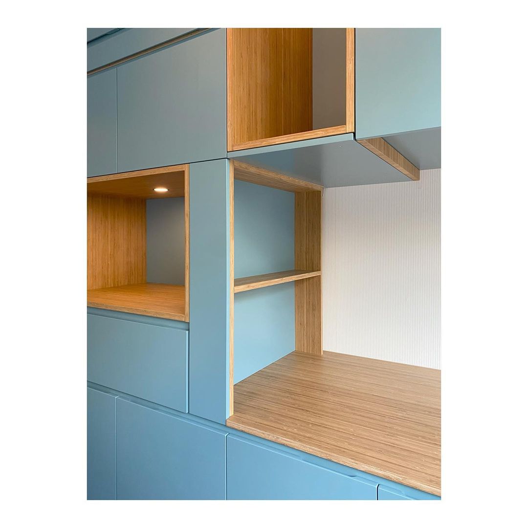 Комбинированная расцветка. Множество открытых полок и выдвижных ящиков.
