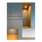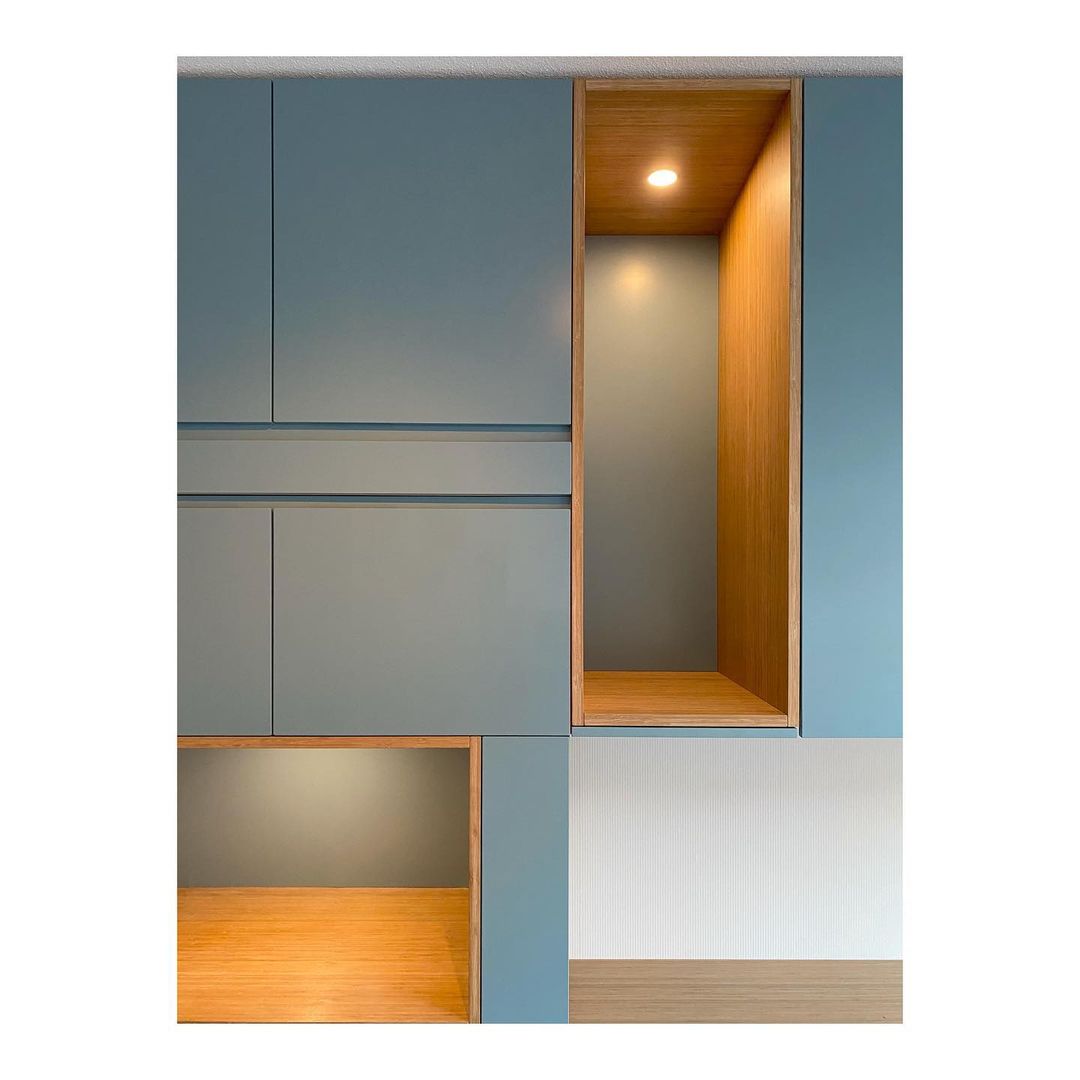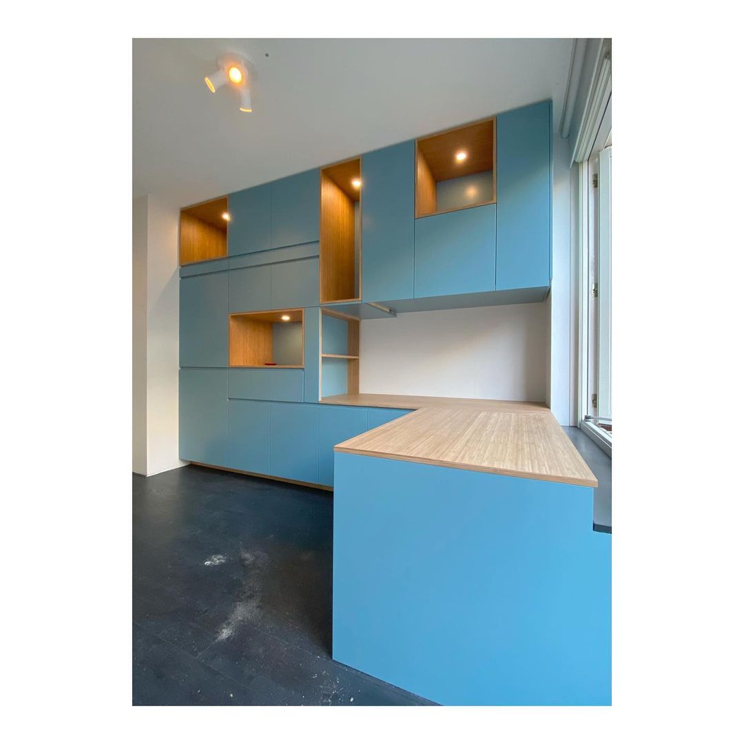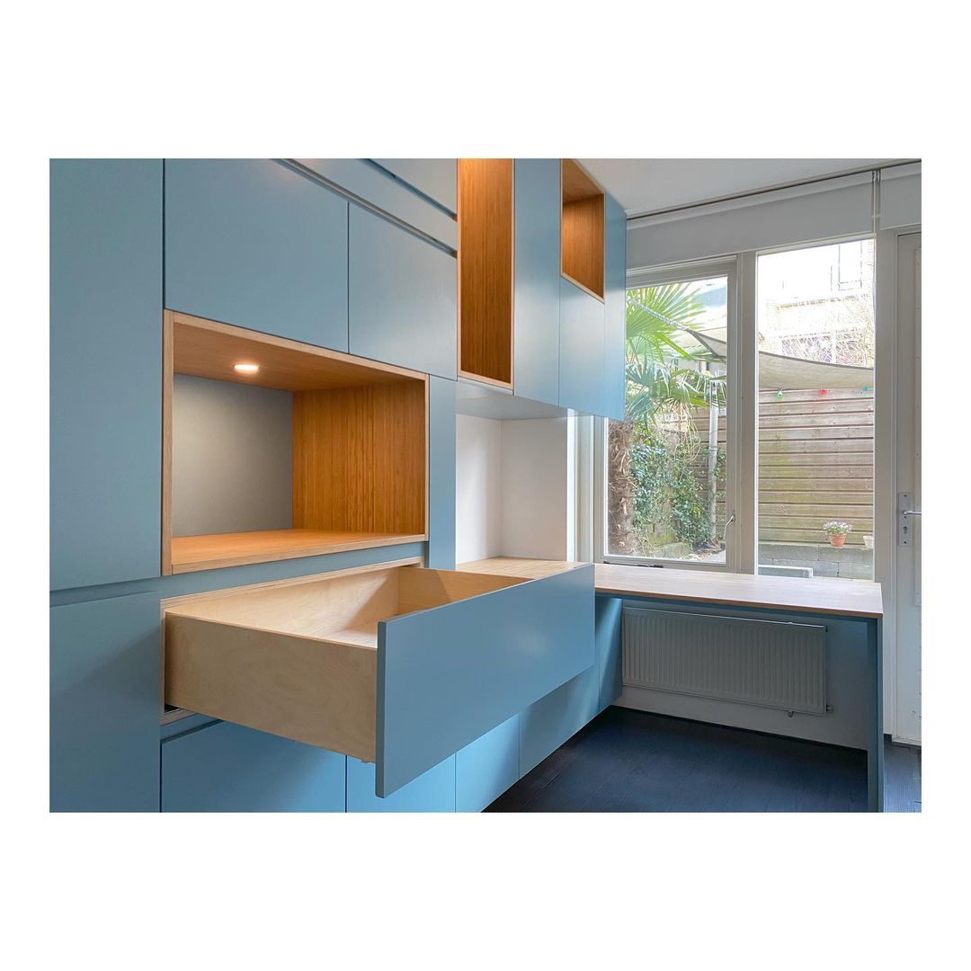 Комбинированная расцветка. Множество открытых полок и выдвижных ящиков.