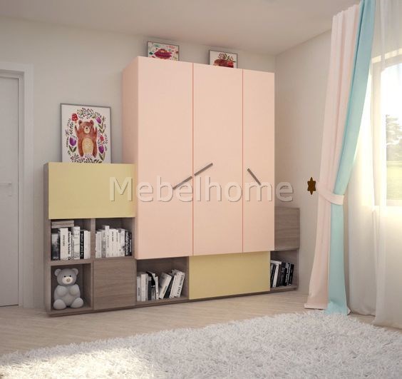 Комбинированная расцветка. Множество открытых полок и выдвижных ящиков.