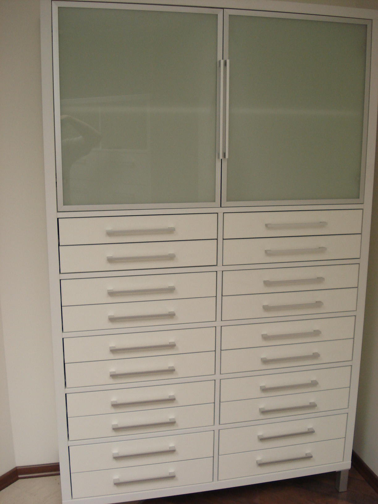Шкаф оснащен полками, отсеком со штангой для плечиков и выдвижными ящиками.