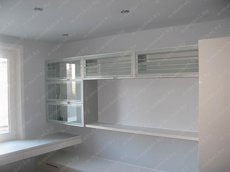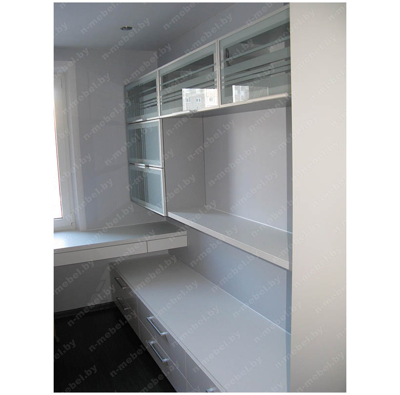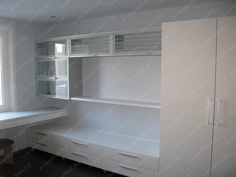 Стенка, выполненная в белом цвете, оснащена вместительным шкафом с распашными створками. Напольный ряд представлен в виде нескольких выдвижных ящиков с ручками в тон фасадам, подвесная часть представляет собой шкафчики с застекленными створками. Современная конструкция за счет светлого оформления зрительно увеличит пространство вашей комнаты и будет отлично гармонировать с остальными элементами обстановки.