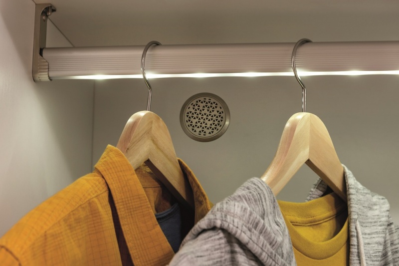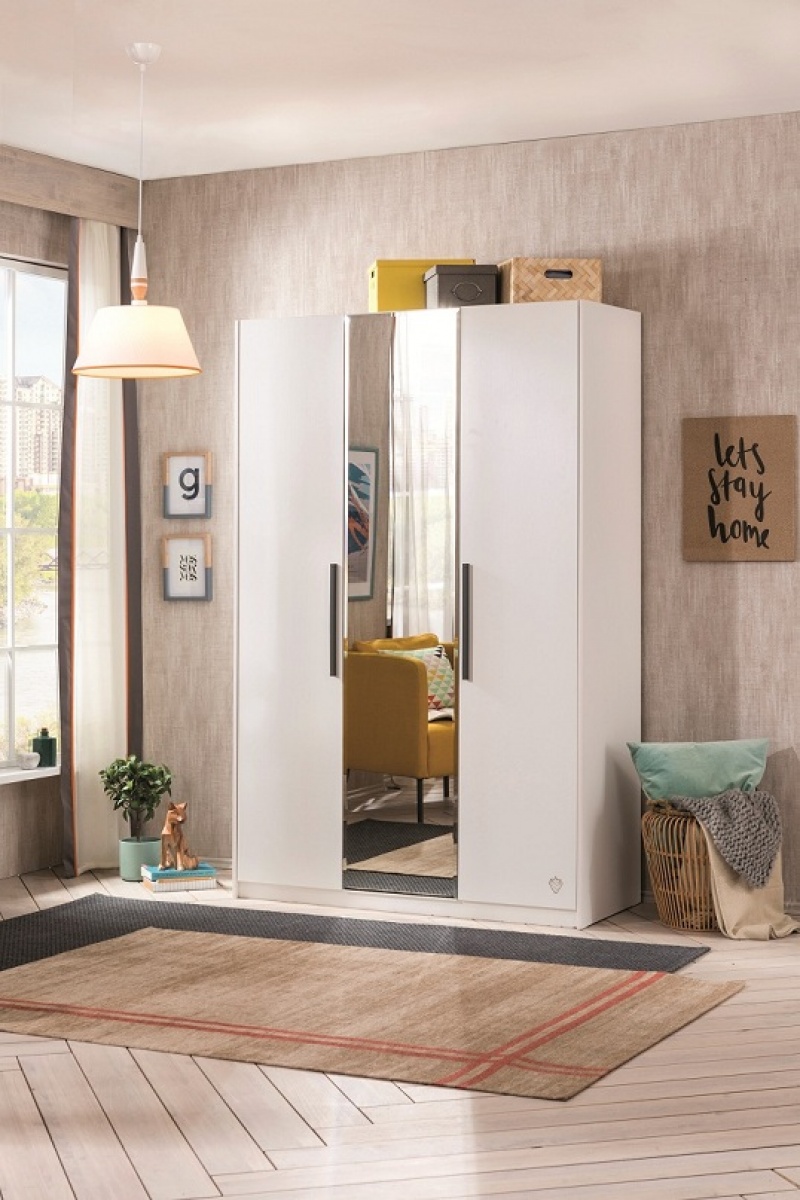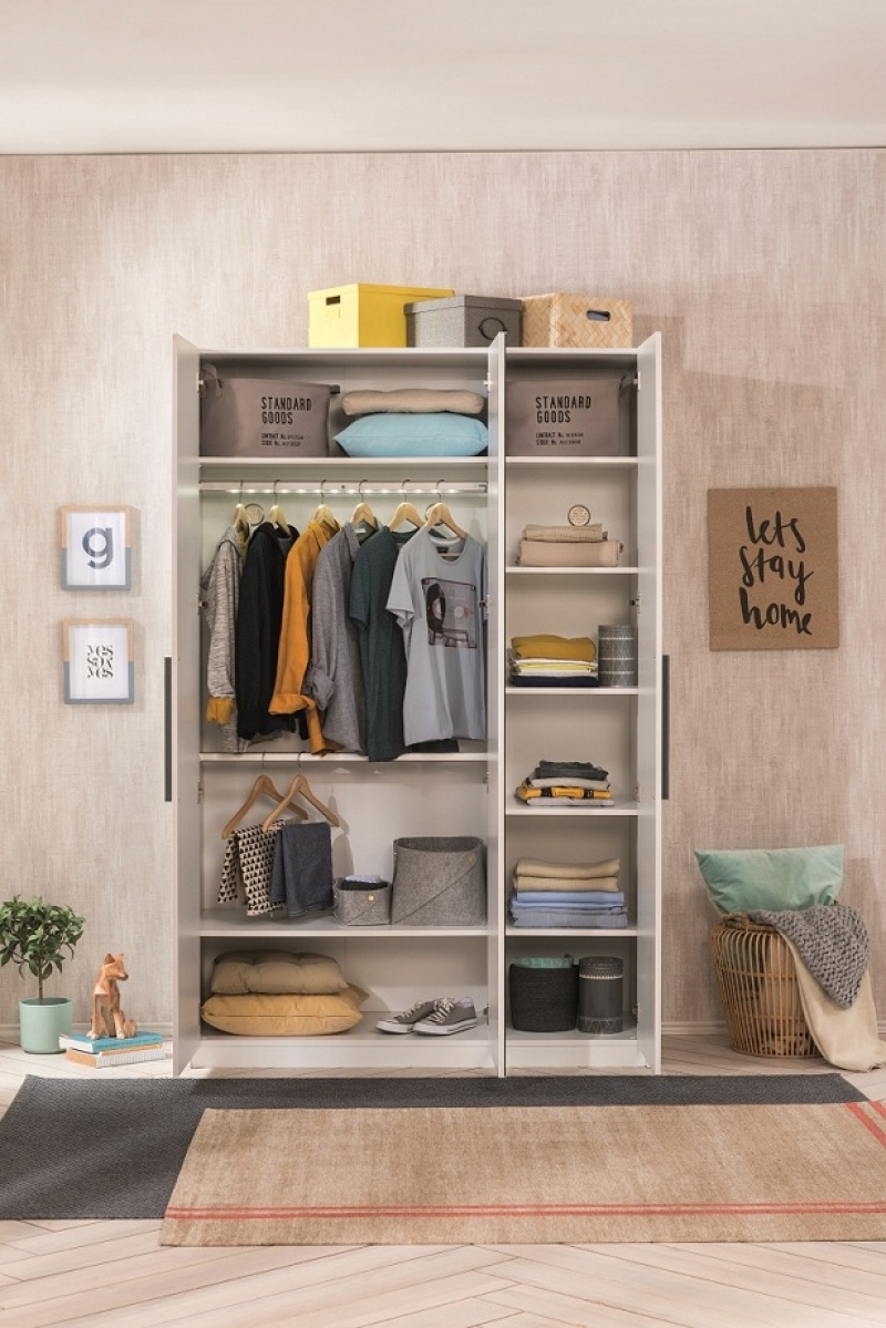 Шкаф оснащен полками, отсеком со штангой для плечиков и выдвижными ящиками.