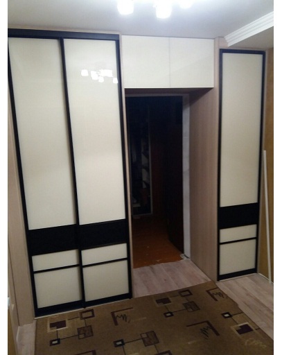 Шкаф-купе отличается неординарным расположением створок, где отдельная створка создает дополнительное пространство. Фасады белый с черными вставками разной ширины. По периметру фасад декорирован стильными черными планками.