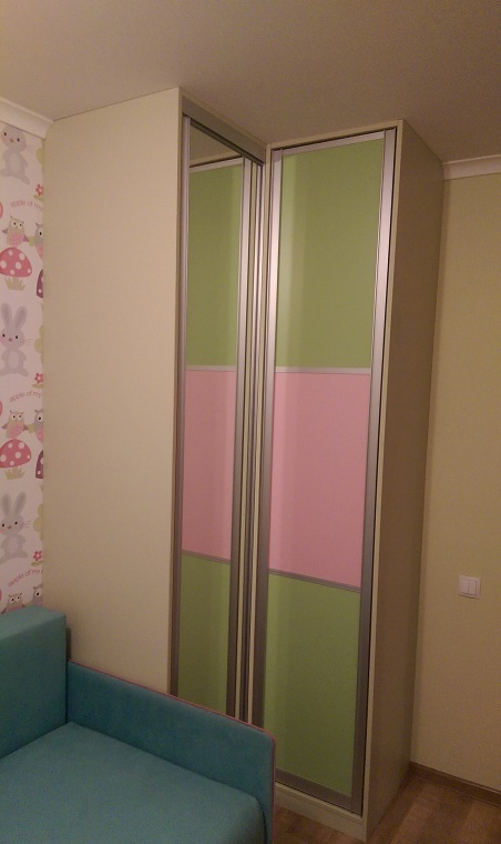 Шкаф купе в детскую. Система Сенатор либо Модус, створки из качественной ДСП розого и салатового цвета. Кромка ПВХ, С-профиль. Зеркало по всей высоте двери.