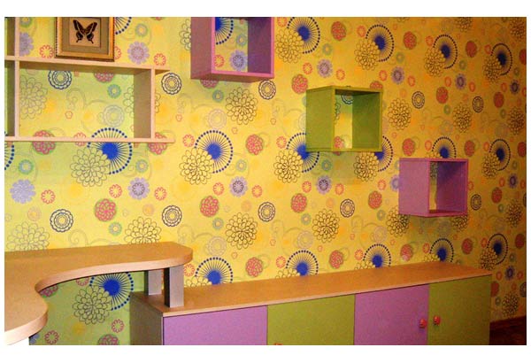 Угловой набор мебели для детской комнаты: низкая угловая тумба с шуфлядами, настенные открытые полки.
