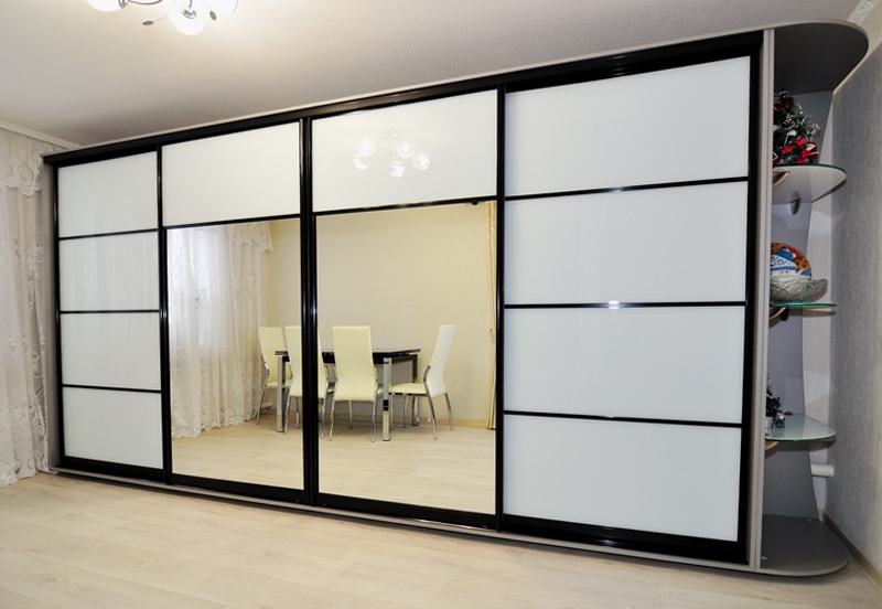 Фасад широкого шкафа в четыре створки украшен белым глянцевым лакобелем, рассеченным черными перегородками в тон профилю, удачно дополнен двумя зеркальными вставками.