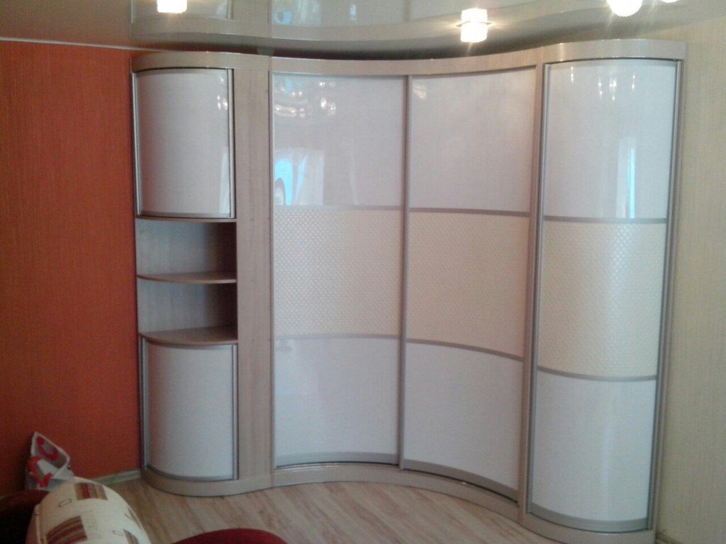 Шкаф-купе выполнен в белом цвете и декорирован глянцевыми переливами. Радиусная конструкция смотрится очень стильно и необычно. Универсальный белый цвет фасада дополнен бежевой вставкой, которая подчеркивает форму мебели.