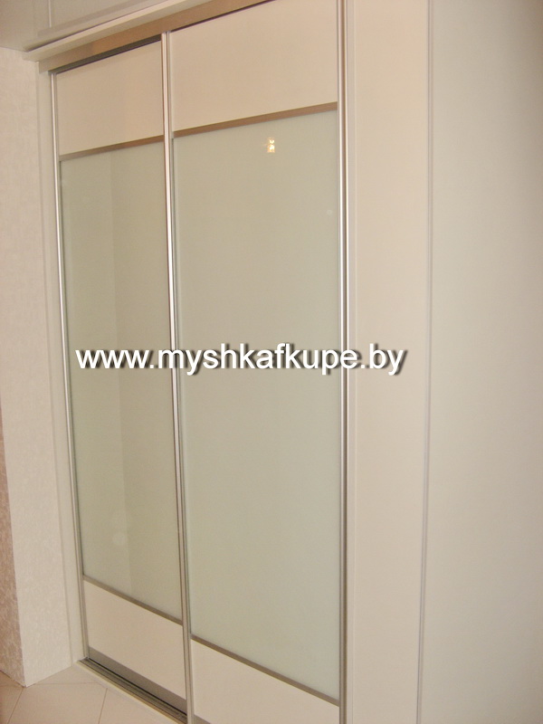 Встроенный гардеробный шкаф-купе изготовлен с двумя створками в матово-глянцевой горизонтальной комбинации. Панели непрозрачного стекла лакобель посередине чередуются со вставками белого ЛДСП и разделяются серебристыми перегордками в тон профилю.