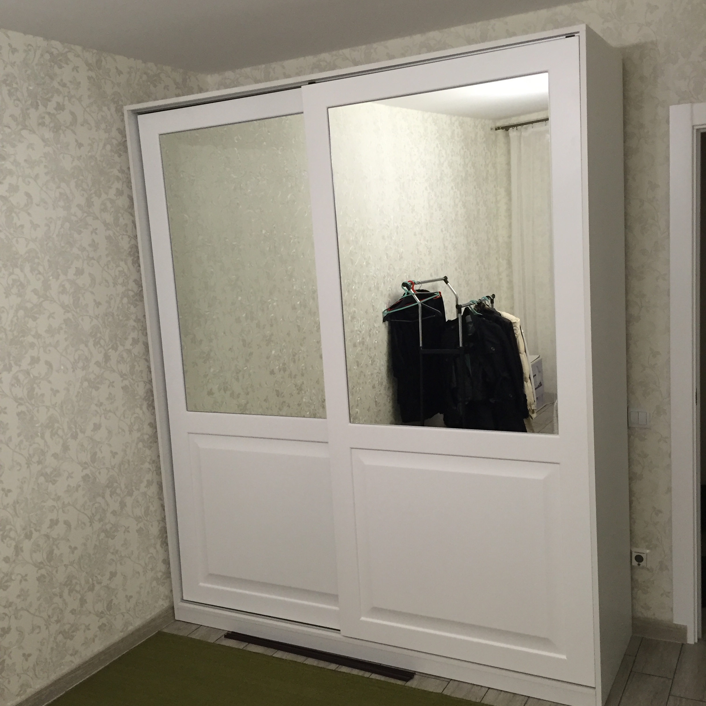 Светлая модель шкафа-купе для спальной комнаты или прихожей. Зеркальные створки.