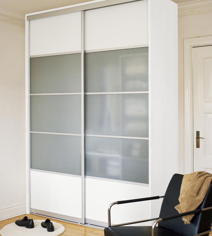 Очень современный и стильный шкаф-купе имеет линейную конструкцию с двумя раздвижными створками. Фасад выполнен в белом или молочном цвете, створки декорированы вставками из матового и слегка прозрачного стекла с алюминиевыми рейками. Такой дизайн прекрасно впишется и украсит интерьер в стиле скандинавский.