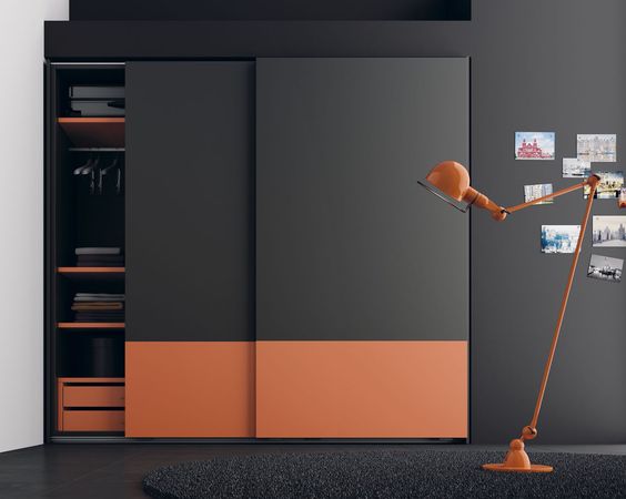 Черный матовый шкаф-купе выглядит стильно и оригинально. Выразительным акцентом дизайна фасада является оранжевый низ, который «приглушен» черным верхом.