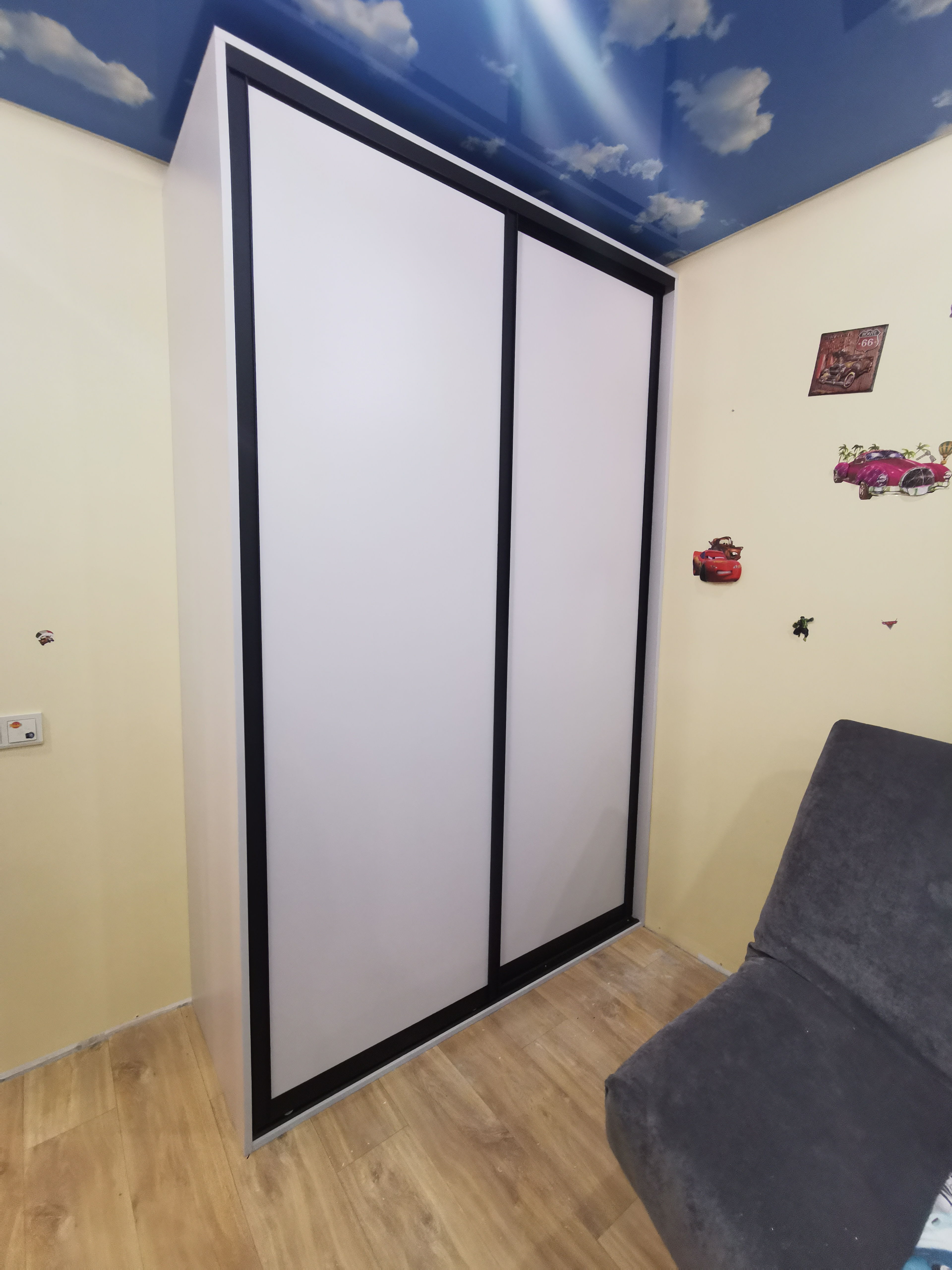 Темный шкаф-купе габаритами 138x220x60 см. Два зеркала с противоударной пленкой.