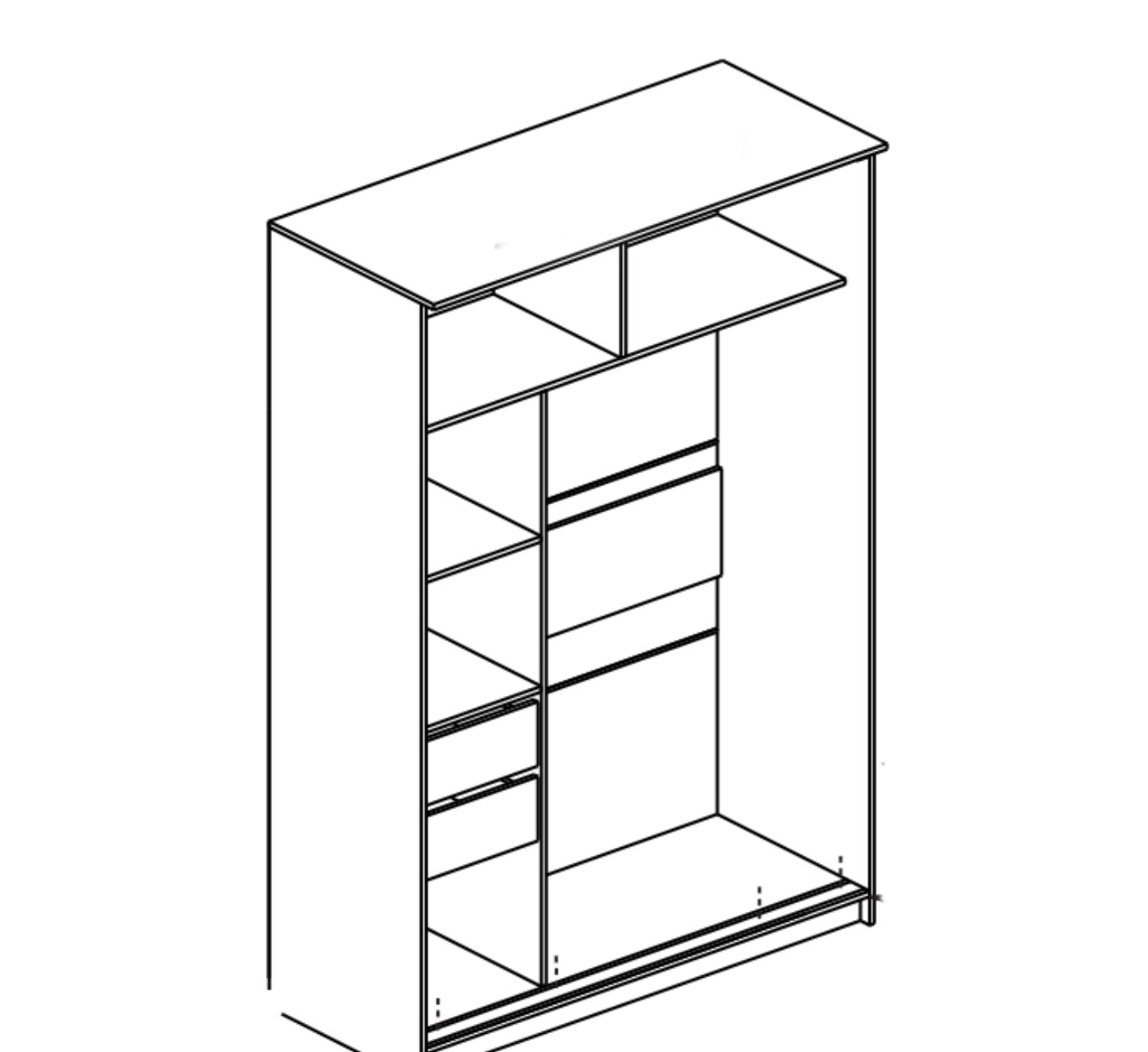 Две секции внутри. В правой части находятся полки, в левой – металлическая штанга и антресоль.