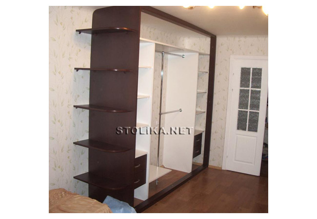 Сбоку изделие оснащено радиусными полками, предназначенными для размещения элементов декора или небольших вещей. Изнутри шкаф оснащен выдвижными полками, вешалкой для одежды и полками. Створки выполнены с раздвижным механизмом.