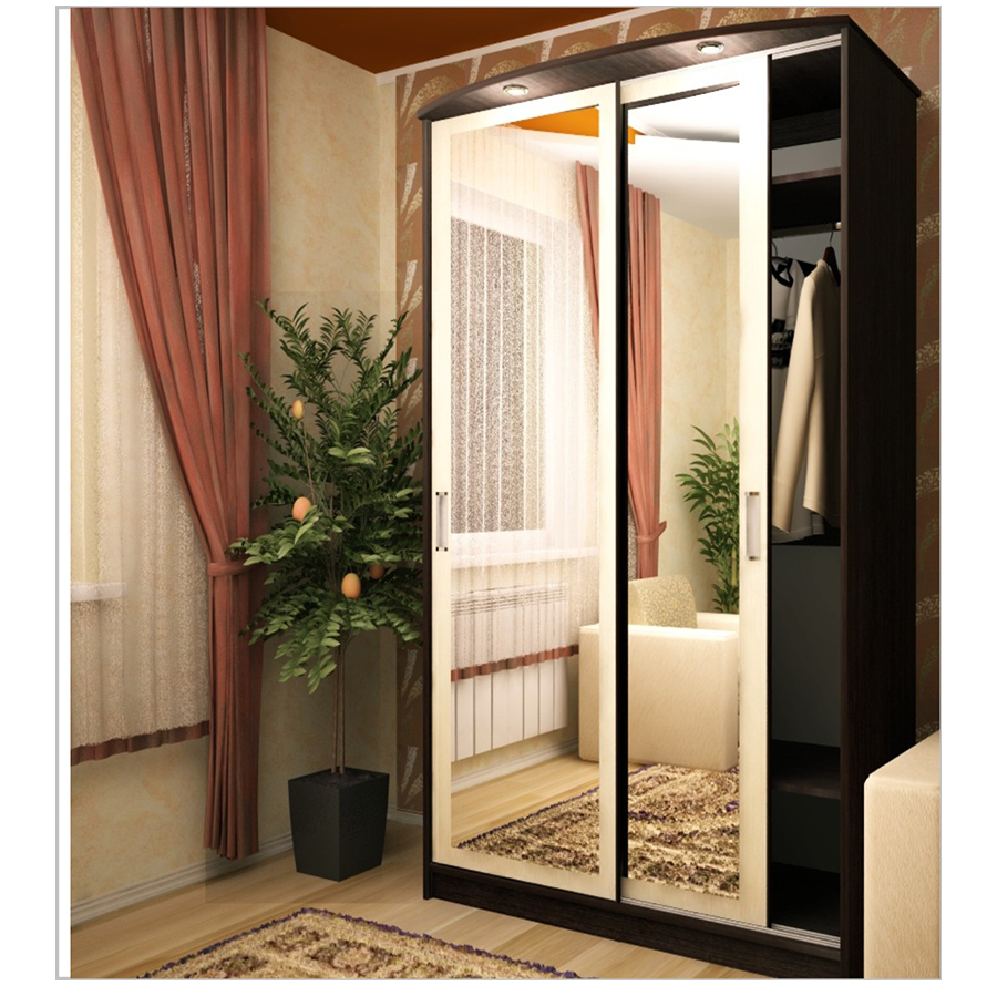 Компактный шкаф-купе с раздвижными створками с большими зеркалами оснащен карнизом с подсветкой. Для удобного пользования створки шкафа укомплектованы небольшими металлическими ручками. Внутреннее наполнение шкафа позволит разложить и развесить все ваши вещи и хранить их в полном комфорте.