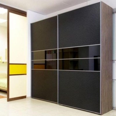 Простая конструкция данного шкафа-купе подойдет для большинства вариантов интерьера. Темный корпус и фасады представленной модели органично украсят спальную или прихожую комнату. Фасад украшен глянцевыми вставками из черного лакобеля.