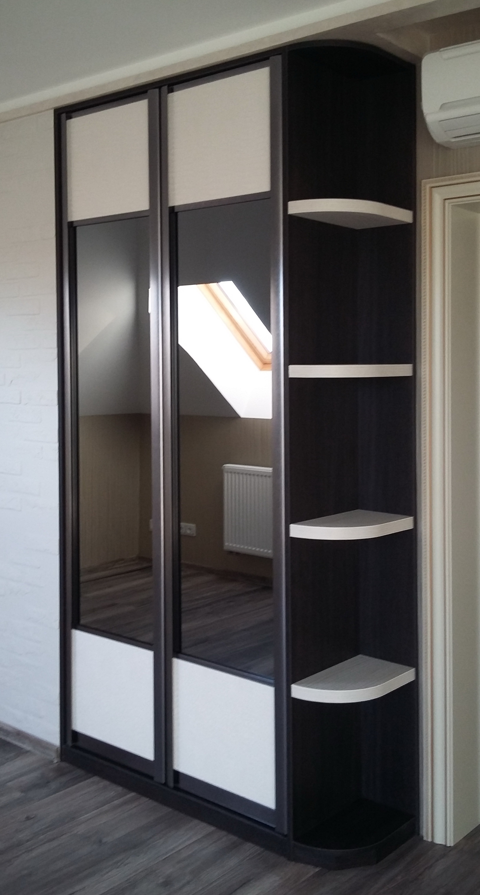 Двустворчатый шкаф-купе в корпусе под черное дерево оборудован секцией на четыре белые закругленные полки. Фасад с высокими тонированными зеркалами посередине дополнен белыми кожаными вставками сверху и снизу, широкий профиль стального оттенка.