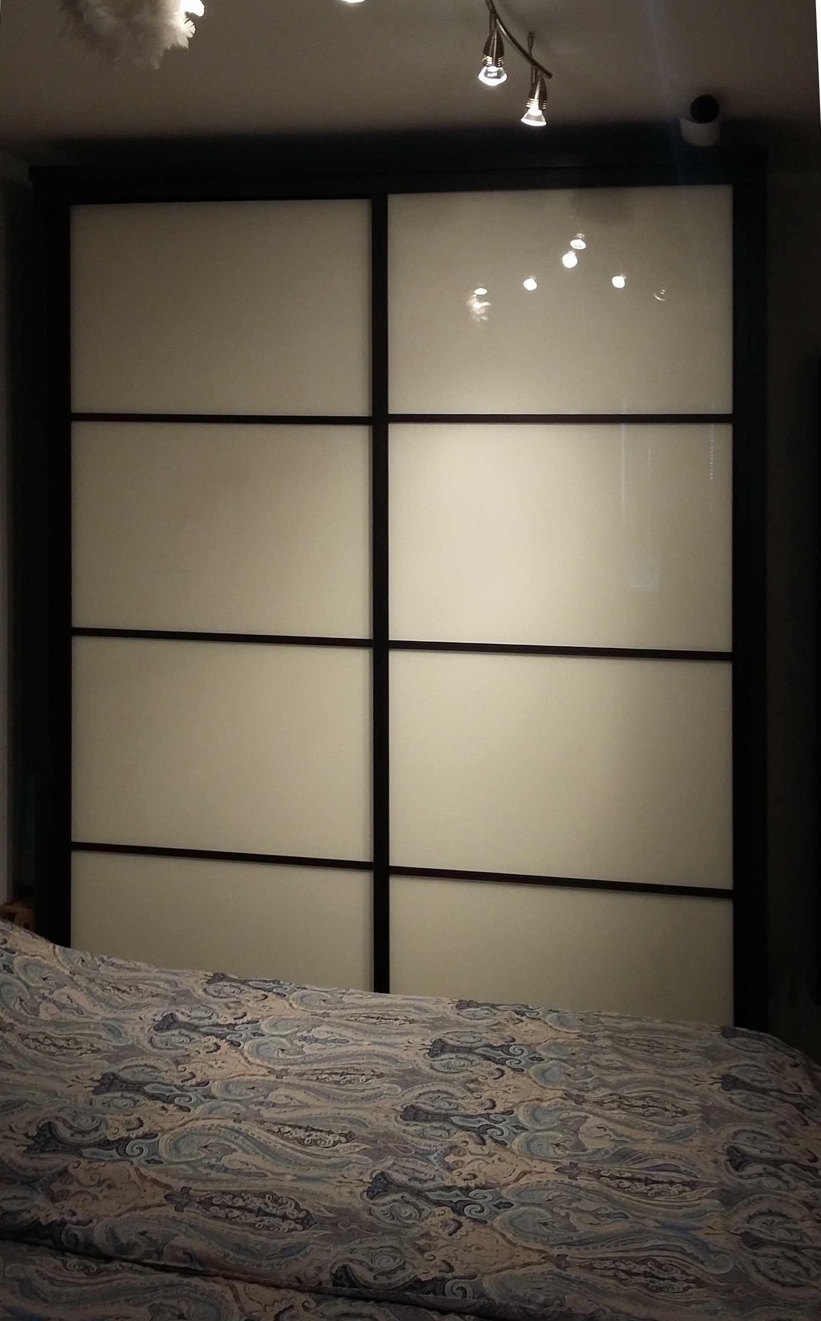 Большой шкаф-купе для спальни или гостиной. Профиль глянцевый, корпус матовый с древесной фактурой.