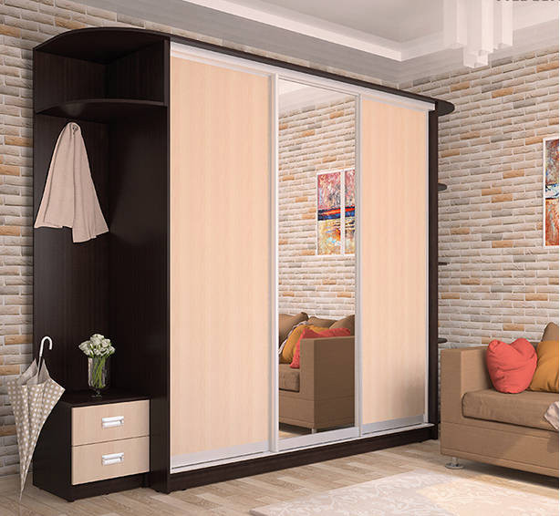 Трёхдверный шкаф купе дополнительно укомплектован выдвижными ящиками и угловым терминалом.