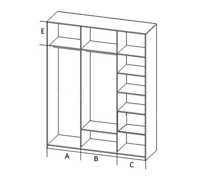 Три отсека шкафа с полками, двумя штангами, четырьмя выдвижными ящиками.