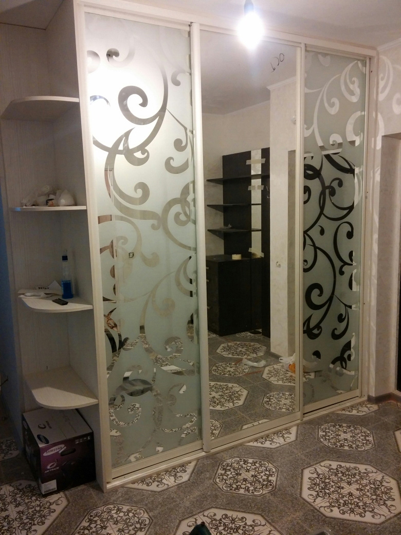 Шкаф-купе отличается своим стильным дизайнерским исполнением. Трехдверная мебель украшена узорами на матовом стекле. В модель встроено зеркало по центру для удобства эксплуатации. Боковые открытые полки радиусной формы.