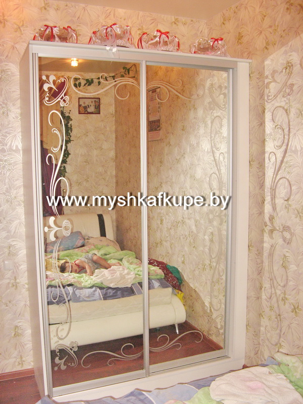Двустворчатый шкаф-купе изготовлен в светлом корпусе с крышкой и подиумом. Полностью зазеркаленные дверцы украшены рамкой пескоструйного узора и обрамлены серебристым профилем. Сочетание белого и цвета металлик с поверхностью зеркал визуальной расширит светлое помещение, либо станет выгодным акцентом интерьера в темной цветовой гамме. Стандартное наполнение может варьироваться и дорабатываться исходя из предпочтений заказчика.