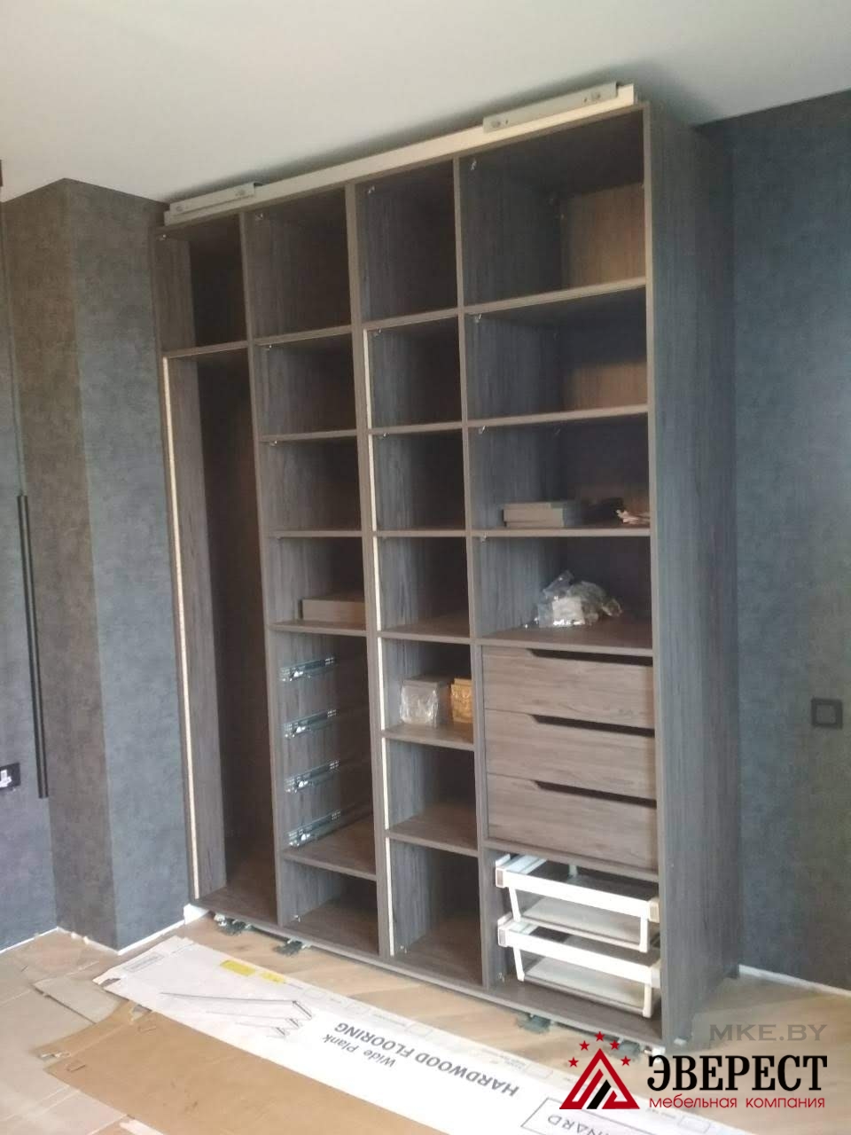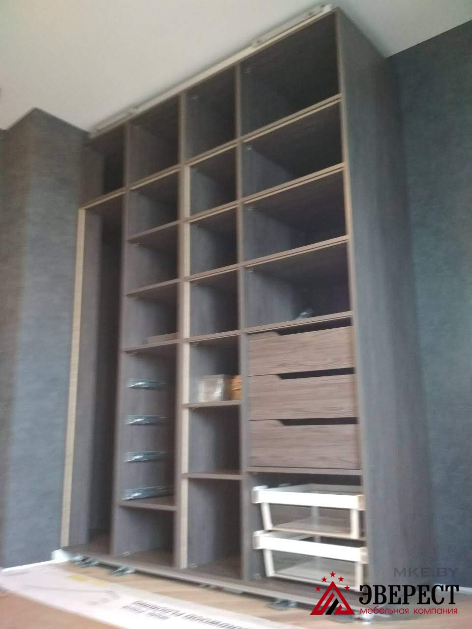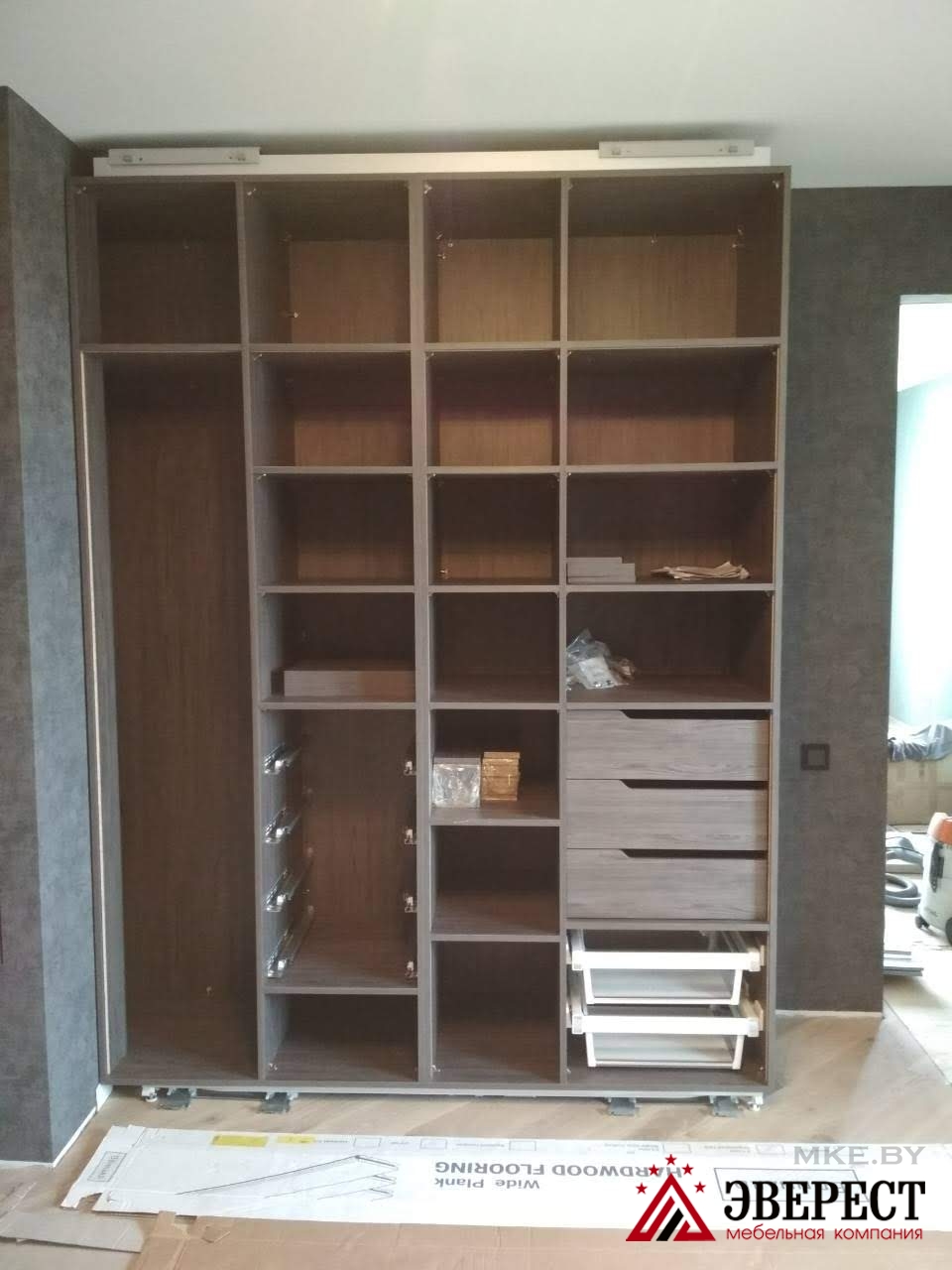 В правой части шкафа-купе расположены 3 полки и 2 выдвижных ящика, в левой – штанга для вешалок, полки.