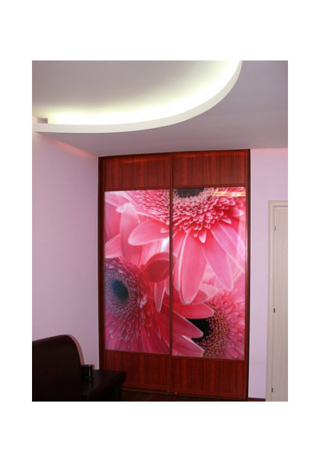 Фасады выполнены в красном цвете и имеют фактуру красного дерева. Декорированы створки изображением «цветы». Конструкция оснащена двумя раздвижными створками.