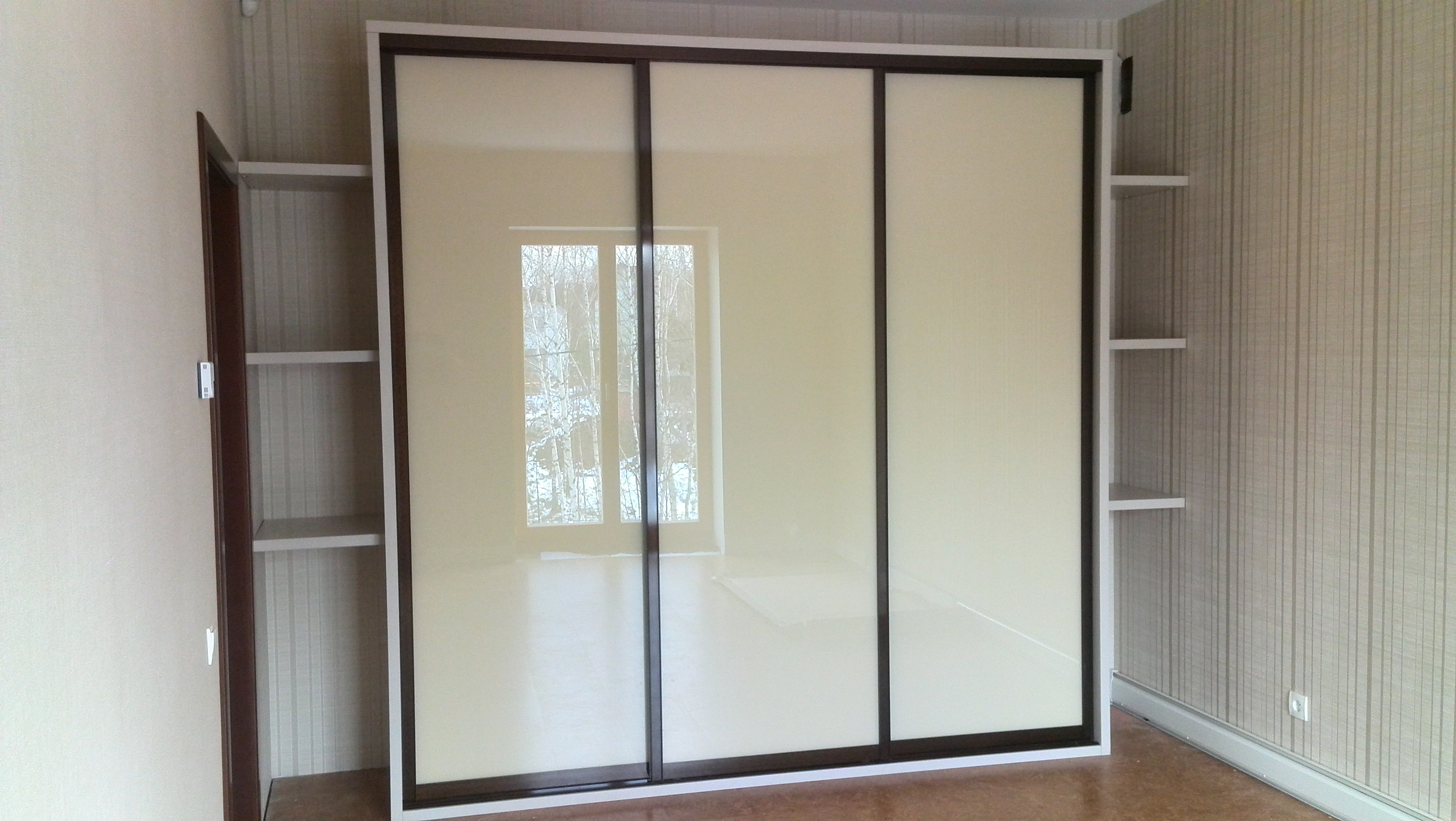 Кремовый глянцевый шкаф-купе с торцевыми полками