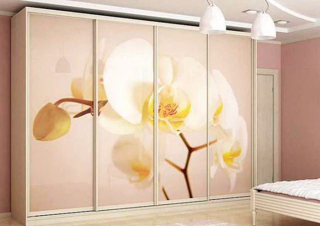 Очень вместительный шкаф-купе имеет четыре створки, которые украшены очень элегантной и привлекательной фотопечатью с изображением цветка орхидеи на нежно розовом фоне. Подобный декоративный прием расскажеть не только о безупречном вкусе хозяев, но и визуально уменьшит габариты шкафа.