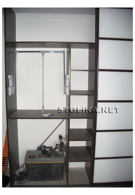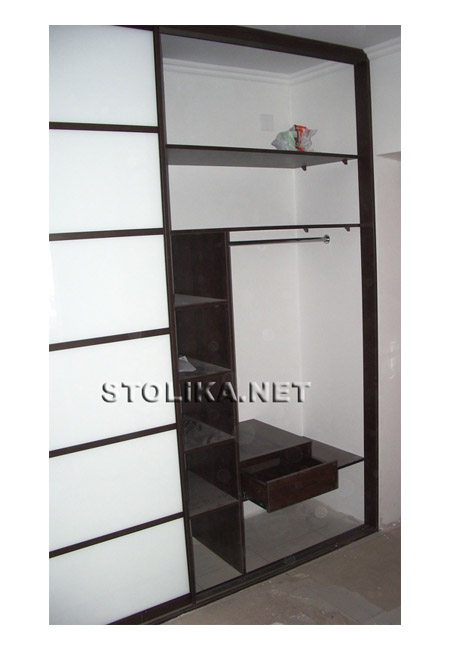 Линейный шкаф-купе характеризуется своей вместительной конструкцией. Выполнен шкаф в цвете венге. Изнутри шкаф-купе оснащен вешалками для одежды, полками для обуви, вещей, а также небольшим выдвижным ящиком.