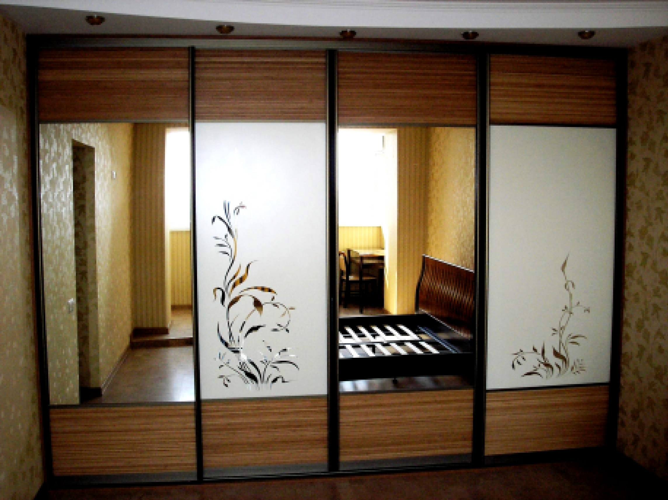 Шкаф в четыре створки с чередованием зеркальных и панелей с пескоструйным нанесением. Индивидуальный дизайн. Качественные материалы. Продуманная эргономика и материалы.