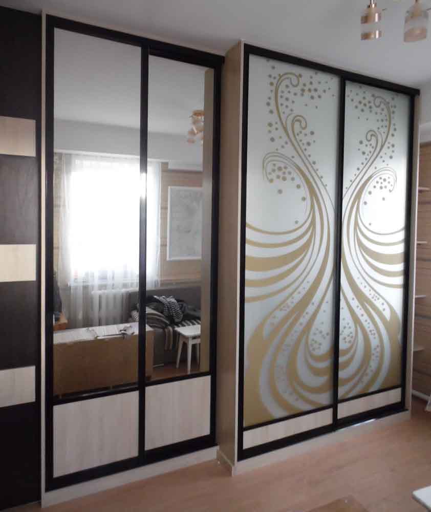 Линейный шкаф-купе предназначен для встраивания в нишу стены. Каркас конструкции изготовлен из высококачественной ДСП. Фасады дополнены зеркальными вставками. Модели имеет стандартное внутреннее наполнение. Раздвижные створки выполнены в профиле цвета венге.