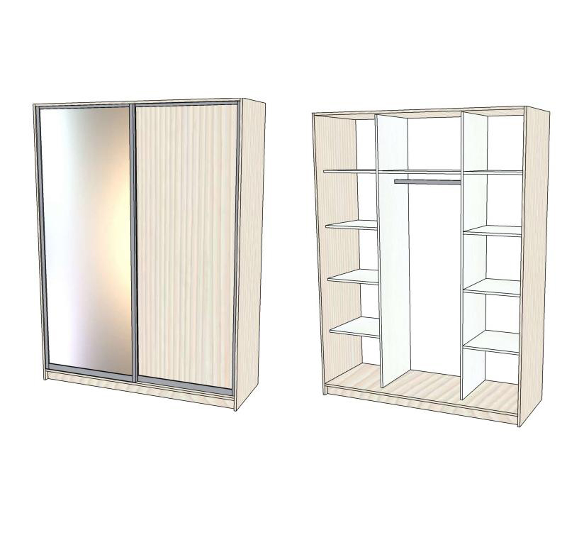 Современный корпусный шкаф-купе. Снаружи изготовлен из ДСП ( на выбор 3 цвета) внутри ДСП белого цвета (Egger). Отделка кромкой ПВХ . Раздвижная система Senator.