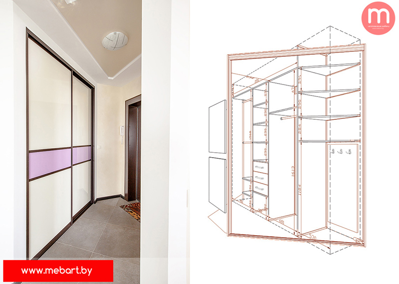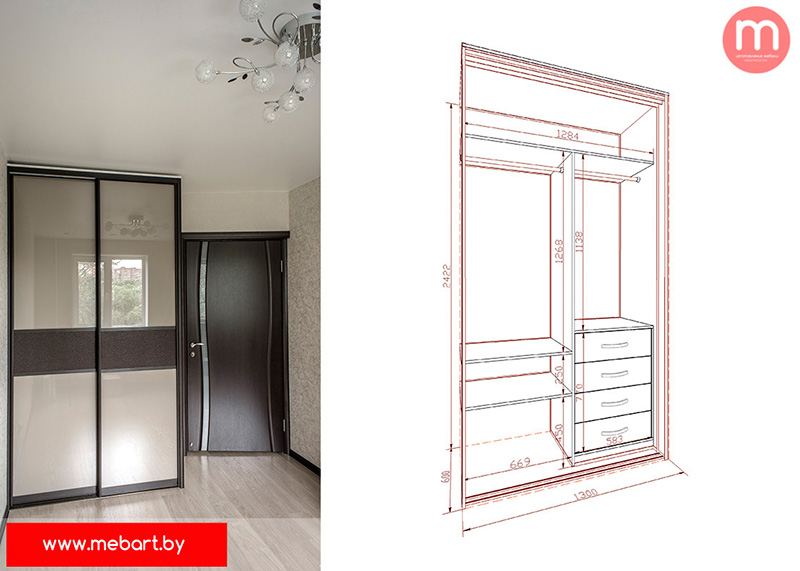 Размер: 1200x1200x2216 мм. Материал: ЛДСП/Зеркало.