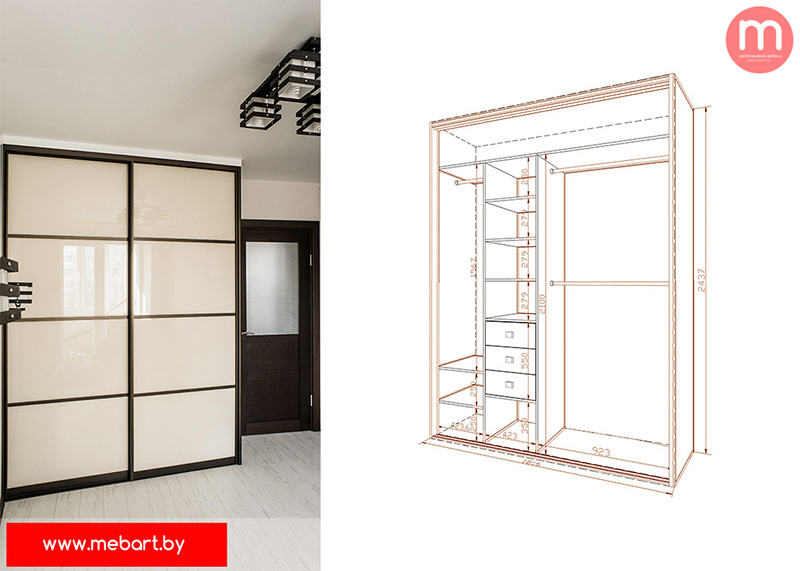 Однотонный шкаф-купе без зеркал с полками справа. Ширина 185 см.