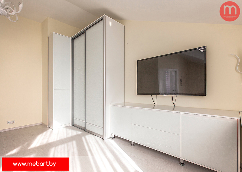 Вместительный шкаф-купе позволит с комфортом гранить одежду всей вашей семьи. Белые глянцевые створки украшают бежевые вставки. С одной стороны модель оснащена открытыми полочками, на которых можно расставить различные предметы декора.