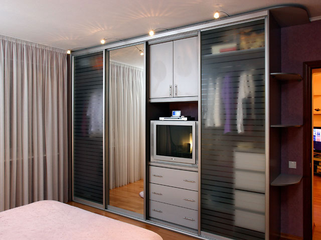 Многофункциональный шкаф-купе на 4 створки оснащен встроенной нишей для ТВ и боковым парусом с полочками. Раздвижные створки выполнены в имитации жалюзей, а также присутствует зеркальная створка во весь рост. Ниша под ТВ оснащена несколькими выдвижными шуфлядами и шкафчиком для хранения вещей. Наполнение шкафа состоит из ящиков и нескольких штанг для вешалок с одеждой.